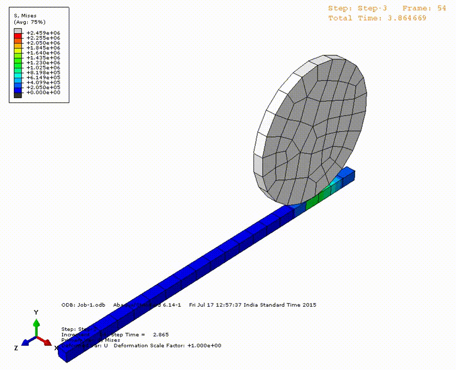 For simplicity let us consider only the track and a wheel. We need to create instances for the wheel and track, define ‘Friction’ contact property between the wheel and the track and apply displacement to the wheel. But the problem is you cannot apply the displacement/rotation on the wheel fully. The rotation has to be applied to the centre of the wheel. Even if the rotation is applied to the centre of the wheel, it just skids away on the track and loses contact with it. This problem was alluring to me because of the challenge it posed and my limited knowledge on ABAQUS to solve it. After some trials in ABAQUS with the help of manual and some websites I solved the problem.