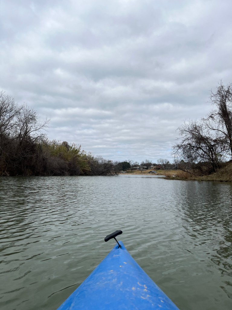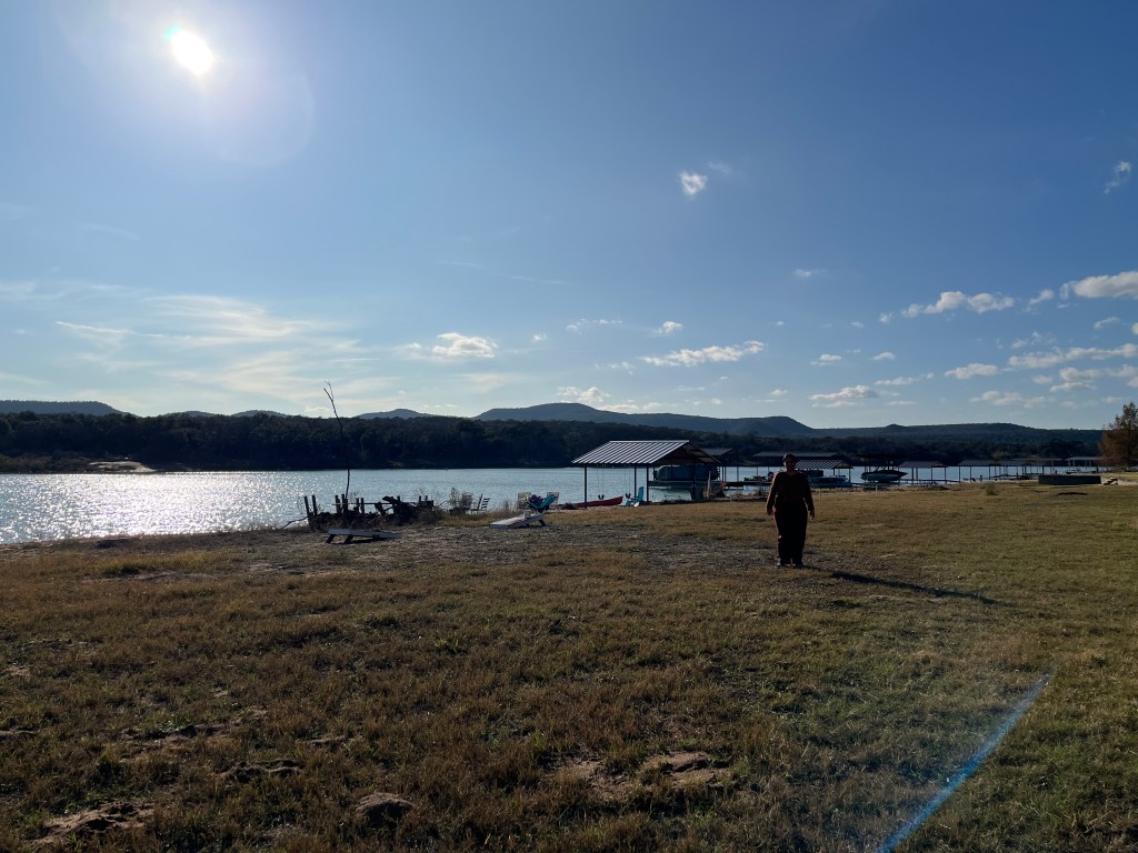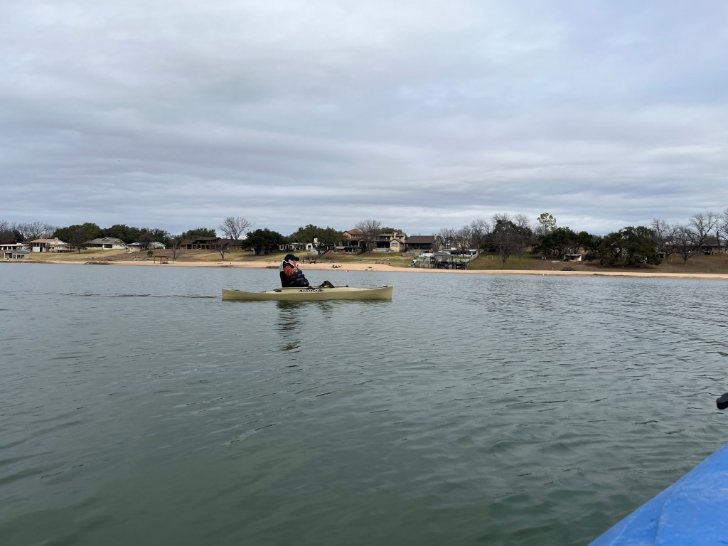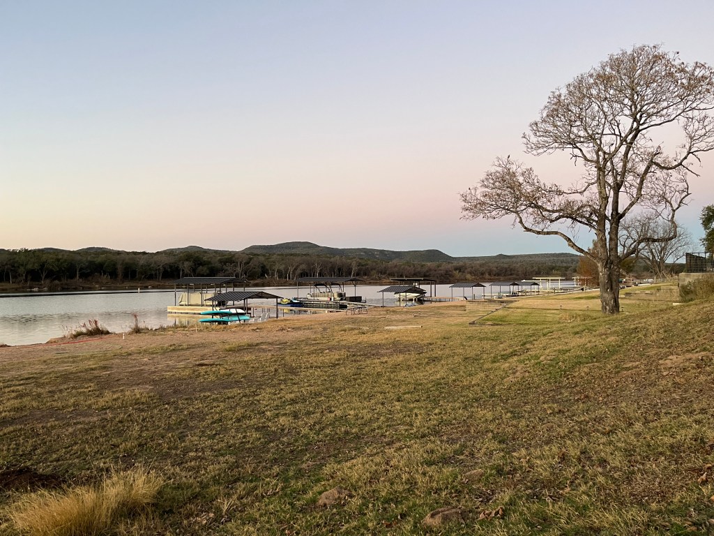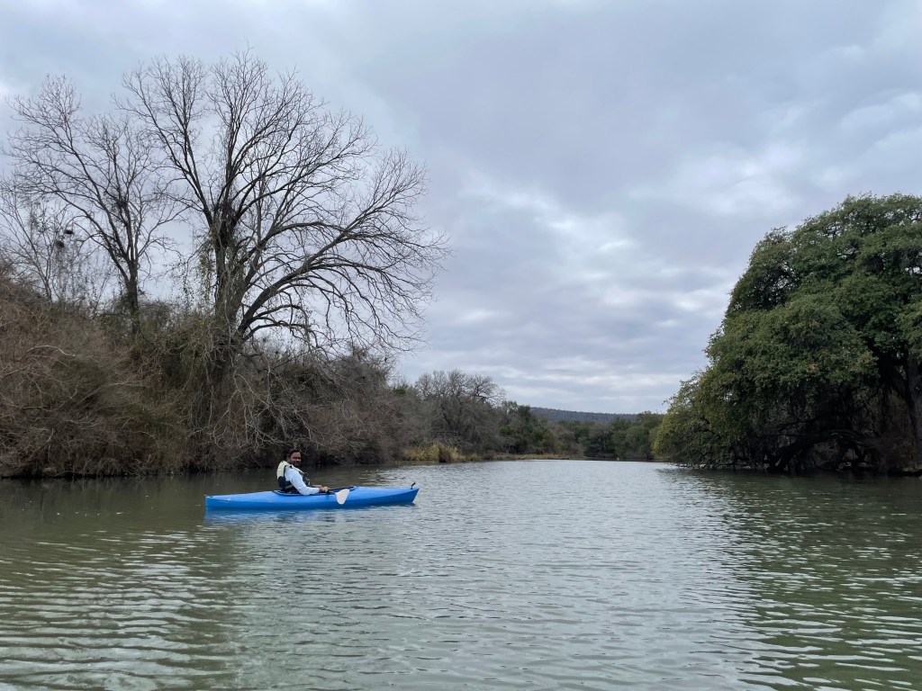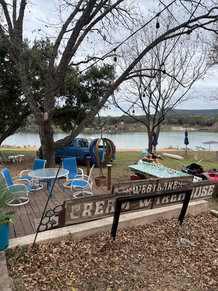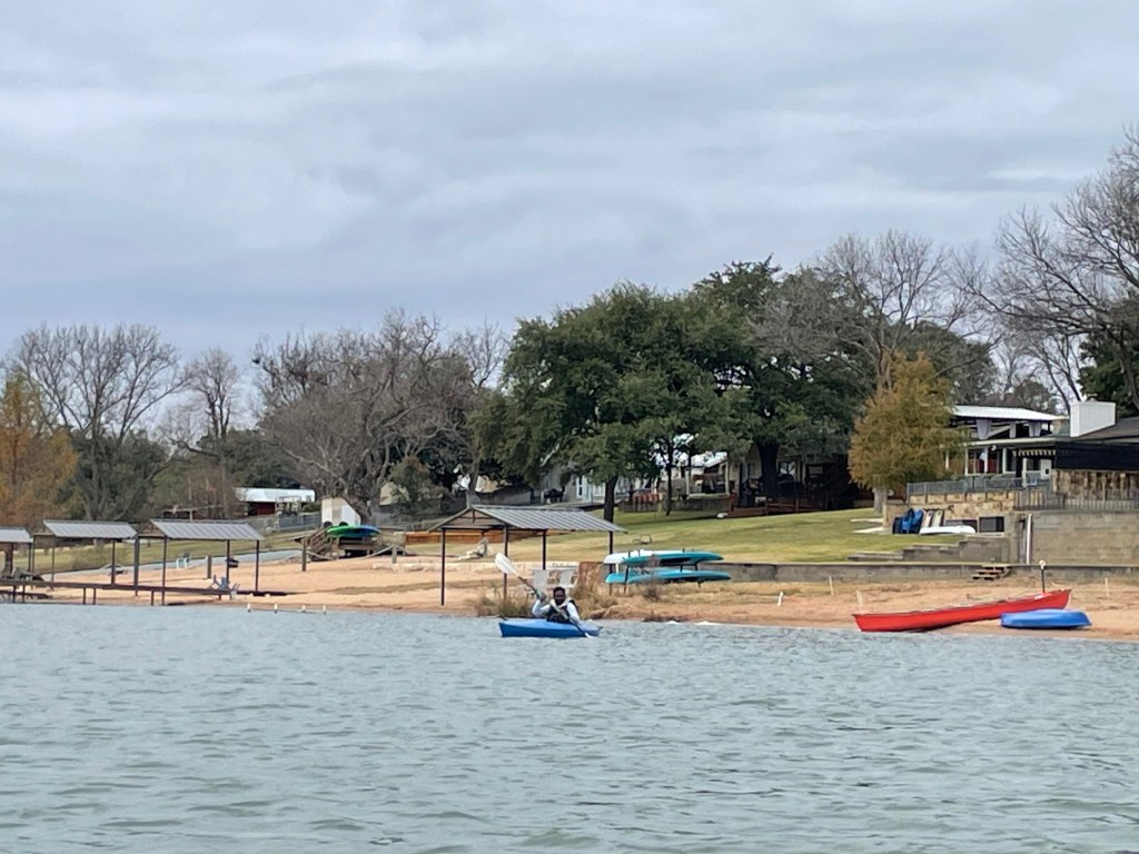 On the next day morning, we wanted to spend more time at Laura’s home and her beach. So we extended the stay by one more day. We decided to try kayaking which was again a first time for both of us. Although I was nervous about balancing the kayak, my swim lessons gave me some confidence to handle if something bad happens. Being in the middle of the river in the kayak looking the river and the hills around was fearful and exciting. After an hour of kayaking, we left for Inks Lake State Park again but this time just to hike. We hiked the Devil’s Hole Trail, Valley of Spring Trail, and the Lower Angler’s Trail. The lake looked so beautiful at the Devil’s Hole. The granite formations and the view from the top of the Valley of Spring Trail was amazing. The Lower Angler’s Trail is along the lake shore facing the setting sun. It was calming to observe the families of geese/swans swim through the lake and arguing with each other like human families. At the end of the trail, we got to see a deer with a calf, both unbothered by our presence after looking at us. What do these deer eat all day long? They don’t seem to stop at any time. We also saw a lot of deer around the residences of Kingsland. We finished the day with burgers at the Boat Town Bar near Lake LBJ. This town does not have a car showroom but has one for boats.