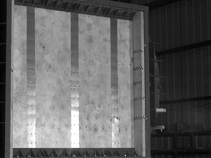 The specimen was tested in the shock tube testing facility of ABS Consulting at San Antonio, TX. The wall performed very well in terms of containing the flying debris which is more critical in blast events. The utility holes in the cold-formed steel studs were ultimately responsible for the failure eventually leading to the pull-out of sheathing. Simple single-degree of freedom (SDOF) models representing the one-way flexural behavior predicted the peak displacement at the center of the wall.