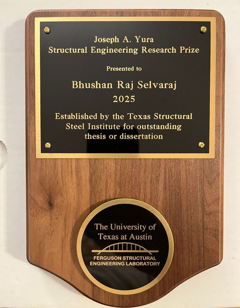 Awarded the Joseph A. Yura Structural Engineering Research Prize for outstanding dissertation in 2025 by the Texas Structural Steel Institute and Ferguson Structural Engineering Laboratory, The University of Texas at Austin. Feeling honored to receive this prestigious award named after Dr. Yura, who contributions to stability and steel design have transformed the structural steel industry.
